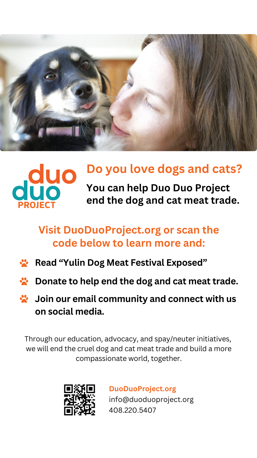 Share your photo with the social media version of How You Can Help on your own social media pages using these hashtags: #PetAppreciation #StopYulinFestival #EndDogMeatTrade #EndCatMeatTrade #DuoDuoProject